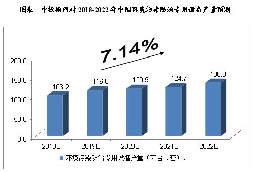2018年我国环境污染防治专用设备产量将达到103.2万台(套),未来五年(2018-2022)年均复合增长率约为7.14%,2022年将达到136.0万台(套)。