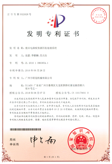 3E机械又又又斩获一发明专利:废旧电路板资源回收处理系统!