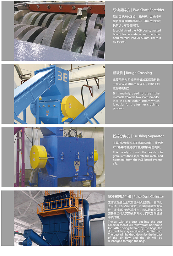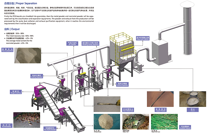 将废旧电路板粉碎到一定粒径,通过分级及分离分选设备将金属粉体和非金属粉体有效地分离,生产过程中其产生的粉尘和废气将分别通过脉冲布袋除尘器和废气净化装置等环保设施处理达标后对空排放。
