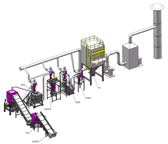 原料通过撕碎、粗破、粉碎、气流分选、振动分离分选、环保处理等工序,可分别回收到以铜为主的贵重金属混合体及非金属粉体混合体;生产过程中产生的粉尘和废气则有序地收集并统一进行除尘和废气净化处理,环保达标后对空排放。