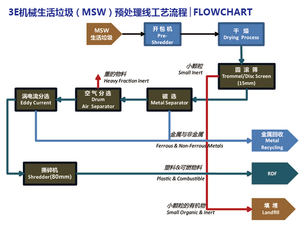 3E机械的生活垃圾(MSW)预处理回收线,能够有效地将生活垃圾中的RDF衍生燃料进行分离。高质量的RDF燃料特点是大小均匀,所含热值均匀,成型工艺可使垃圾热值提高4倍左右,且易运输及储备。RDF衍生燃料可用在发电厂上的能量回收,以电的形式,能量可以高效地利用。燃烧后的灰渣可作为制造水泥的有效成分,为垃圾的能源化拓宽了道路。