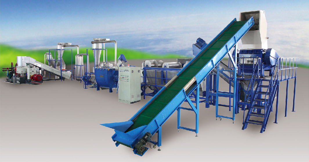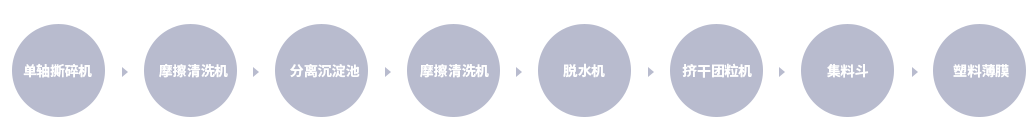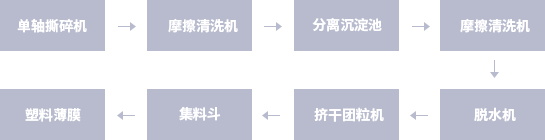 生产线主要由特制的薄膜撕碎机/破碎机,摩擦清洗机,分离沉淀池,脱水机,挤干机或挤干团粒机等设备组成, 整套设备自动化程度高,能耗低,效率高,清洗干净等特点 |